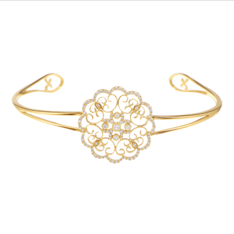 Bracelet jonc personnalisé en or 18 carats avec zircone, motif floral, argent sterling et or jaune. Bijou en or jaune, fabrication artisanale par JINGYING. Convient à différentes occasions.